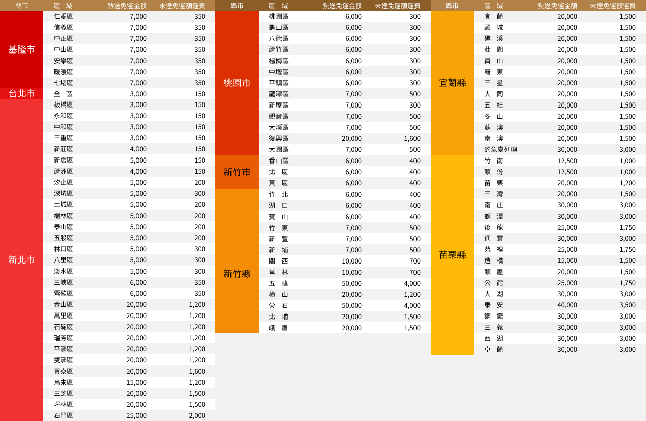 以下熱送免運金額是指單一地址、單次配送。例如:新北市有配送中和(免運額3000)、林口(免運額5000)兩個點: